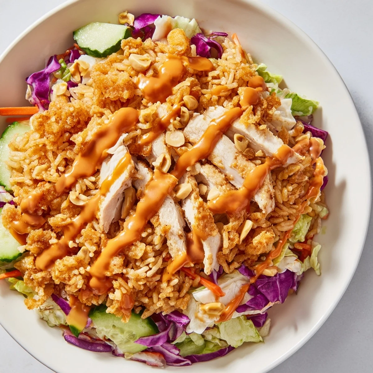 This vibrant bowl brings together golden crispy rice squares with succulent seasoned chicken breast, creating an irresistible foundation of crunch and tenderness. Fresh shredded romaine, purple cabbage, julienned carrots, and crisp cucumber add refreshing layers, while the signature Bang Bang sauce delivers creamy, sweet-spicy perfection with notes of honey, lime, and chili. Roasted peanuts and sesame seeds crown the dish with extra nuttiness. Perfect for lunch or dinner, this Asian-American fusion creation balances heat, creaminess, and fresh crunch in every bite.