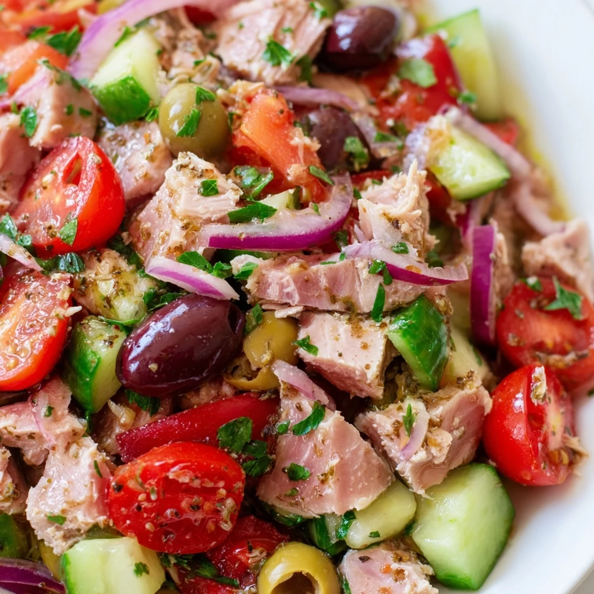 This vibrant Mediterranean-inspired tuna salad comes together in just 15 minutes with no cooking required. Flake olive oil-packed tuna with crisp cherry tomatoes, cucumber, roasted red peppers, and briny Kalamata olives. The simple lemon-olive oil dressing with fresh garlic and oregano brings everything together beautifully. Serve immediately for crunch or let it chill for flavors to meld—either way, it's perfect for warm weather dining.
